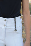 Where competition-ready basics meet an elegant Arabic touch. These white Equerabia breeches carry all the features you need—comfort, practicality, and a flattering fit—now with subtle Arabic-inspired details on one belt loop and the back faux pockets.