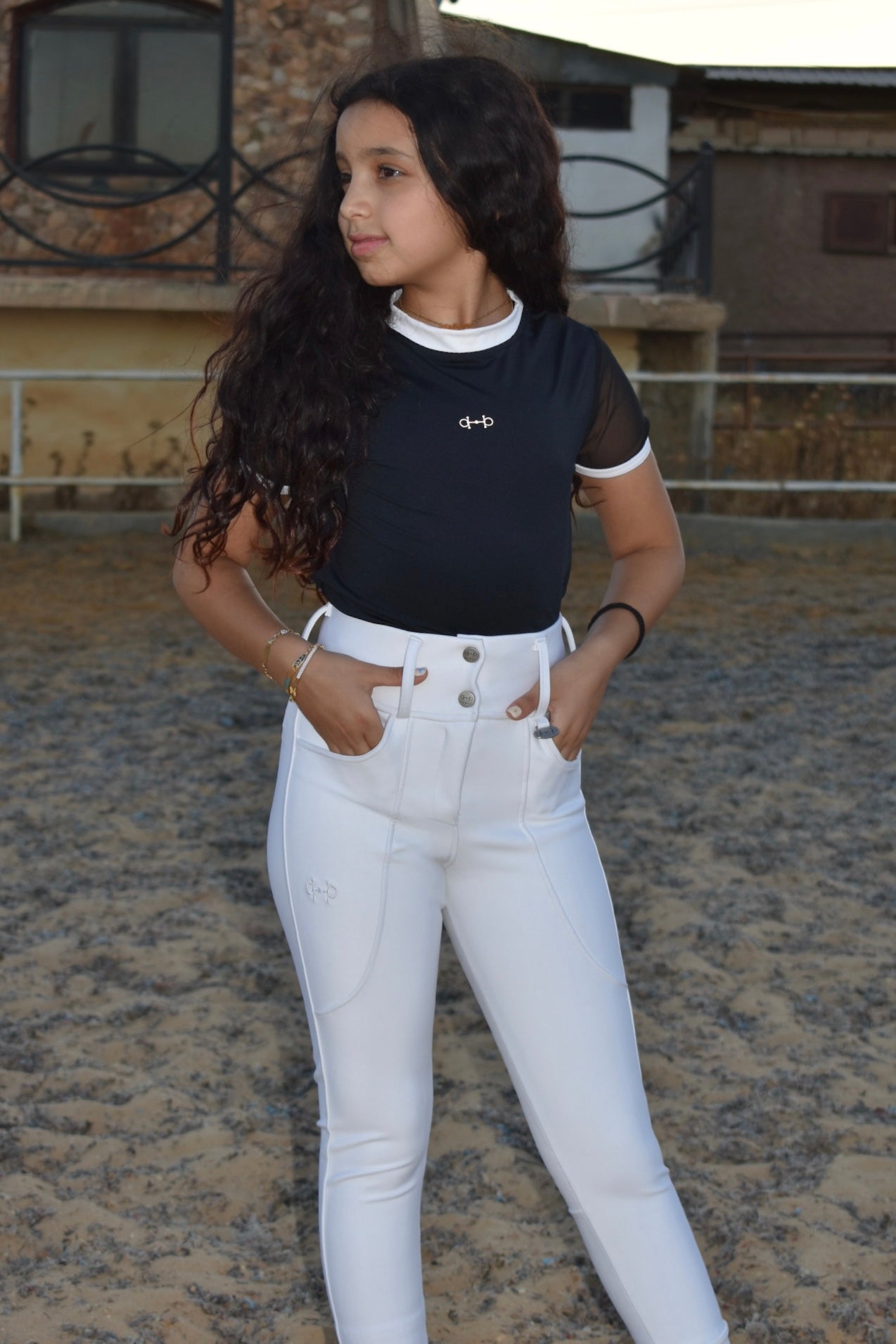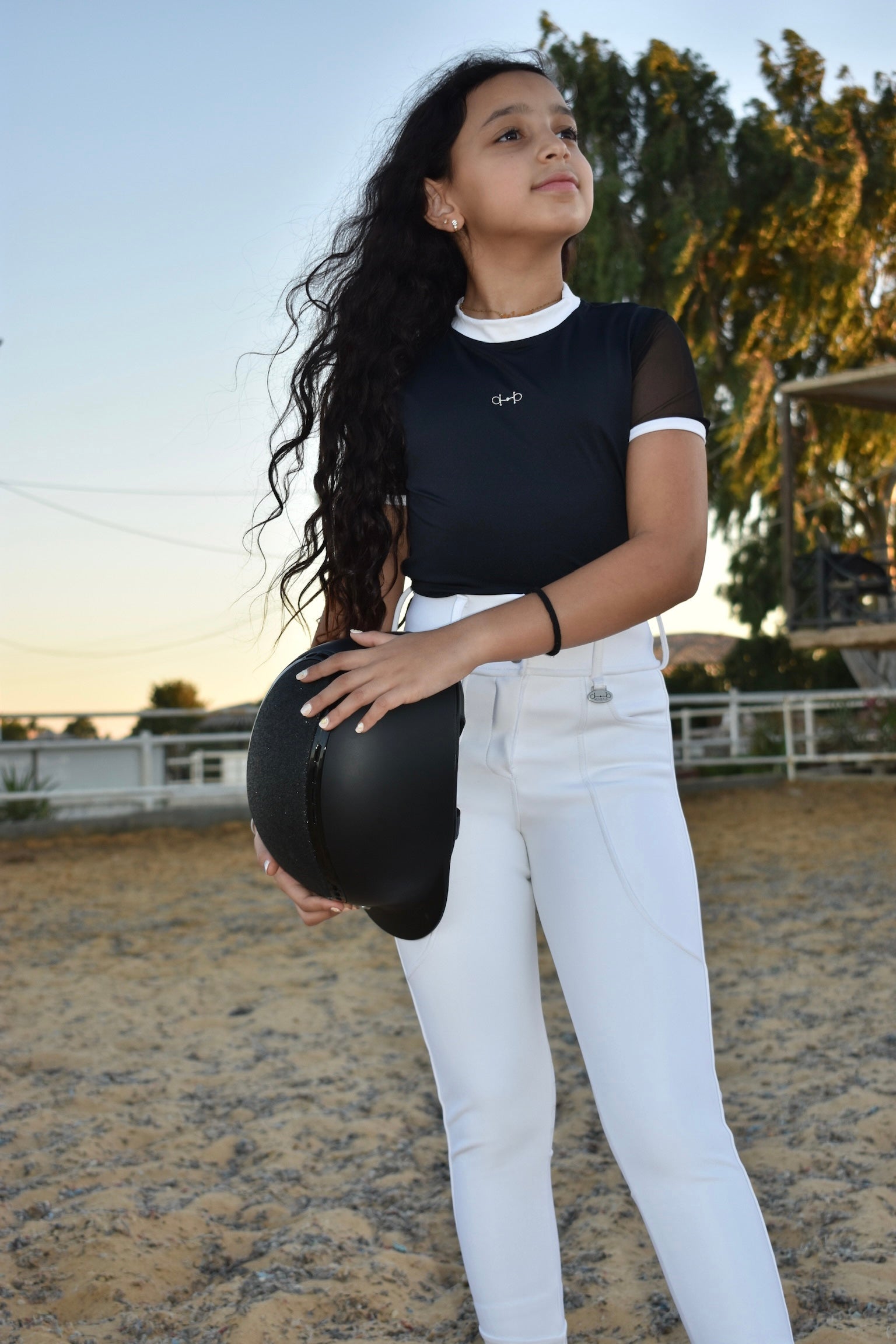 All the comfort and elegance of our adult white breeches, now designed just for our little equestrian stars! Bright and fully non-see-through, these breeches give young riders confidence while moving freely. A soft, stretchy waistband keeps up with fast-growing riders, and deep front pockets securely hold small essentials. The front zipper is designed to stay zipped while riding, and the breathable, water-repellent fabric protects from the sun.